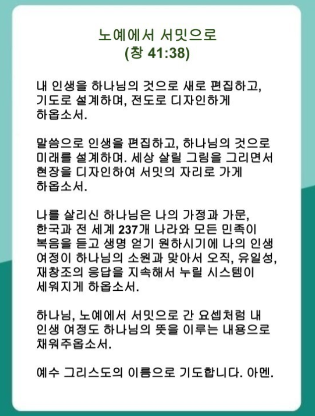 하나님, 노예에서 서밋으로 간 요셉처럼 내 인생 여정도 하나님의 뜻을 이루는 내용으로 채워주옵소서. 예수 그리스도 이름으로 기도합니다. 아멘