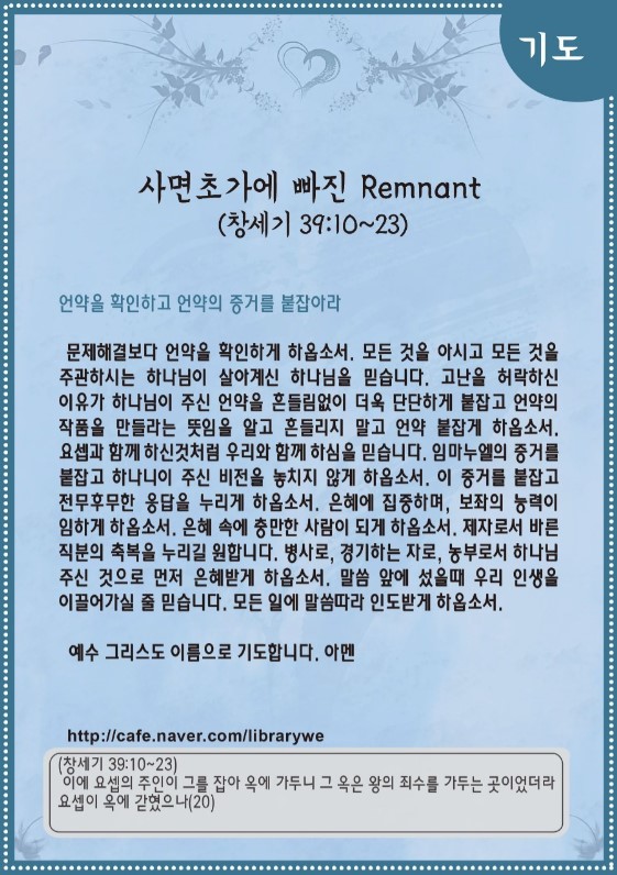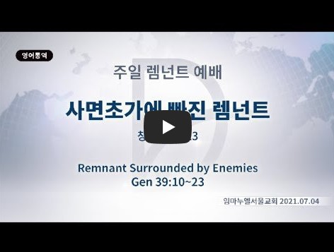 인터넷총국 (홈페이지 http://data.rutc.com) 후원: (국민은행) 856701-04-233309 (사)세계복음화전도협회 인터넷총국 분류 주일예배 설교- 렘넌트 예배 제목 사면초가에 빠진 렘넌트 성경 창세기 39:10-23 일