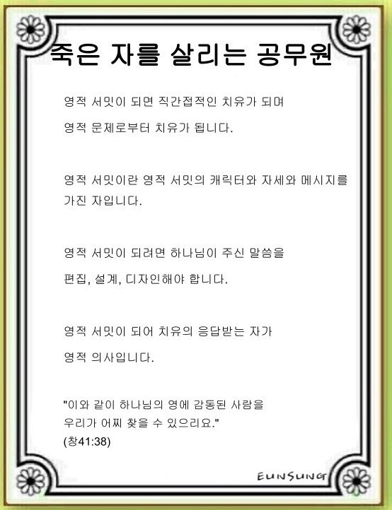 하나님은 공무원을 현장의 죽은 자를 살리는 영적 의사로 부르셨습니다. 그렇기에 현장의 어려움과 사람의 말에 속지 말고 영적 서밋의 캐릭터와 자세, 메시지를 지니고 있어야 합니다. 그러면 어떤 증거를 보게 될까요?