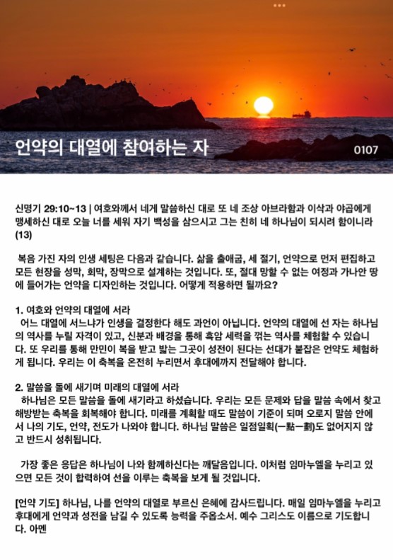 [언약 기도] 하나님, 나를 언약의 대열로 부르신 은혜에 감사드립니다. 매일 임마누엘을 누리고 후대에게 언약과 성전을 남길 수 있도록 능력을 주옵소서. 예수 그리스도 이름으로 기도합니다. 아멘