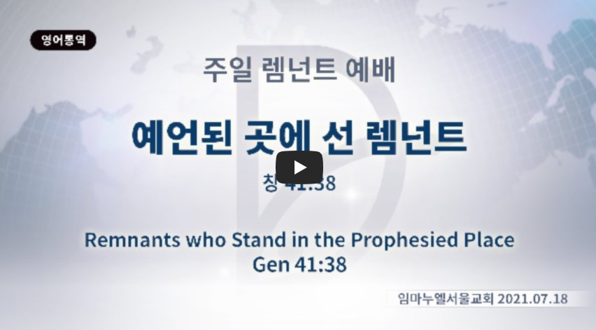 2022년 1월 13일(목) 분류 주일예배 설교- 렘넌트 예배 제목 예언된 곳에 선 렘넌트 성경 창세기 41:38 일시/장소 2021년 7월 18일, 임마누엘 교회 강사 류광수 목사 (정리: 차동호 목사) 주제어 ♠성경