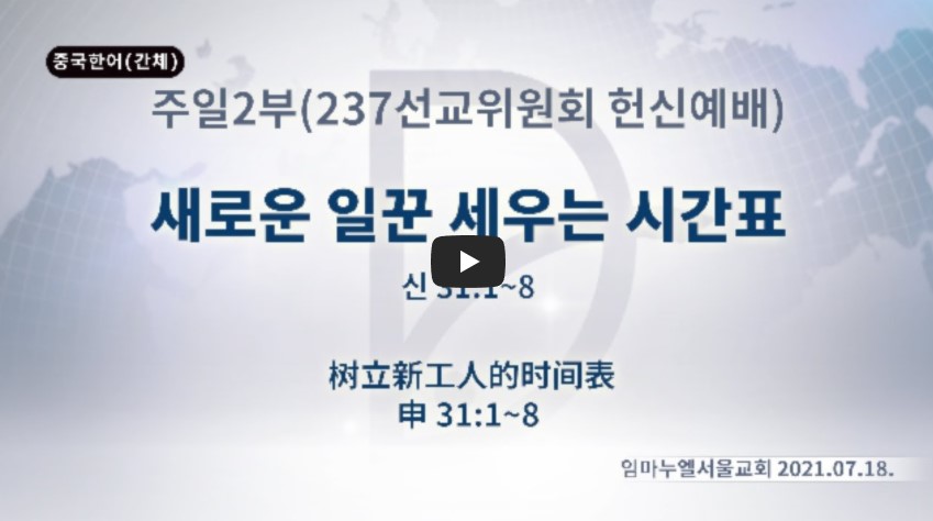 2022년 1월 14일(금) 분류 주일예배 설교- 주일2부 제목 (237선교위원회 헌신예배) 새로운 일꾼 세우는 시간표 성경 신명기 31:1-8 일시/장소 2021년 7월 18일, 임마누엘 교회 강사 류광수 목사 (정리: