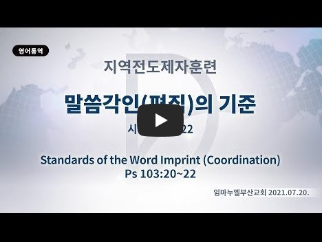 2022년 1월 15일(토) 분류 237화요제자훈련- 전도제자 제목 말씀(각인-편집)의 기준 성경 시편 103:20-22 일시/장소 2021년 7월 20일, 임마누엘교회 (온라인) 강사 류광수 목사 (정리: 차동호 목사) 주제