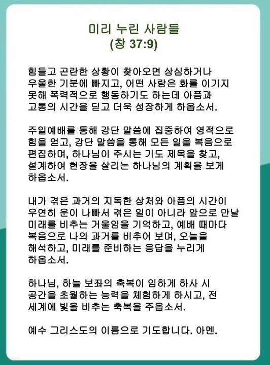 과거에 묶여 있는 사람은 앞으로 받을 응답을 보기 어렵습니다. 과거에 상처받은 일이나 힘들었던 상태에 계속 사로잡혀 있으면 우울과 불안, 분노와 죄책감 등을 떨치지 못하고, 밤새 고민에 사로잡혀 몸에도 병이 찾아옵니다. 각자가 겪은 과거는 앞으로 만날 미래를 비추는 거울입니다. 지독한 상처와 아픔의 시간이 우연히 운이 나빠서 겪은 일이 아닙니다. 예배 때마다 복음으로 나의 과거를 비추어 보고, 오늘을 해석하며 미래를 준비하는 응답을 누려야겠습니다.