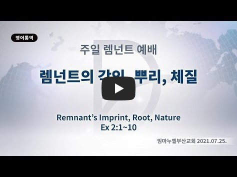2022년 1월 22일(토) 분류 주일예배 설교- 렘넌트 예배 제목 렘넌트의 각인, 뿌리, 체질 성경 출애굽기 2:1-10 일시/장소 2021년 7월 25일, 임마누엘 교회 강사 류광수 목사 (정리: 차동호 목사) 주제어