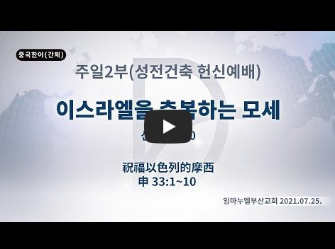 2022년 1월 24일(월) 분류 주일예배 설교- 주일2부 제목 (성전건축헌신예배) 이스라엘을 축복하는 모세 성경 신명기 33:1-10 일시/장소 2021년 7월 25일, 임마누엘 교회 강사 류광수 목사 (정리: 차동호