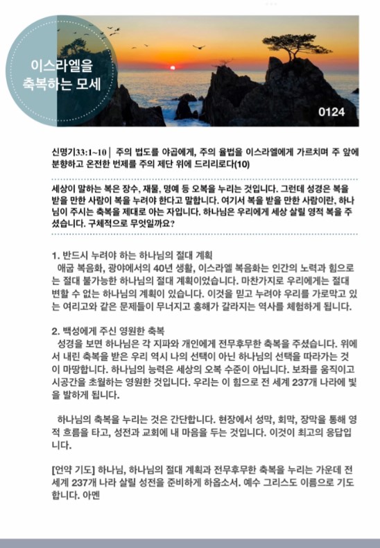 성경을 보면 하나님은 각 지파와 개인에게 전무후무한 축복을 주셨습니다. 위에서 내린 축복을 받은 우리 역시 나의 선택이 아닌 하나님의 선택을 따라가는 것이 마땅합니다. 하나님의 능력은 세상의 오복 수준이 아닙니다. 보좌를 움직이고 시공간을 초월하는 영원한 것입니다. 우리는 이 힘으로 전 세계 237개 나라에 빛을 발하게 됩니다.