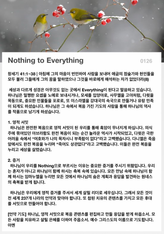세상과 다르게 성경은 아무것도 없는 곳에서 Everything이 된다고 말씀하고 있습니다. 하나님은 멀쩡한 요셉을 노예로 보내시거나, 모세를 입양아로, 사무엘을 고아처럼, 다윗을 목동으로, 중요한 인물들을 포로로, 또 이스라엘을 강대국의 속국으로 만들거나 유랑 민족이 되게도 하셨습니다. 하나님은 그 속에서 복음 가진 기도의 사람을 통해 하나님의 역사를 작품으로 남기게 하셨습니다.