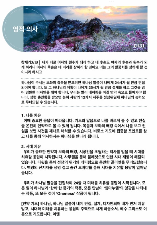 우리가 하나님 말씀을 편집하여 24할 때 미래를 치유할 응답이 시작됩니다. 모든 일이 하나님과 ‘함께’한 증거의 작품, 모든 만남이 ‘임마누엘’의 영광을 나타내는 작품, 또 모든 것이 ‘Oneness’ 작품이 됩니다.
