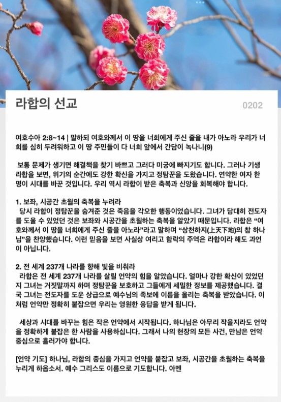 [언약 기도] 하나님, 라합의 중심을 가지고 언약을 붙잡고 보좌, 시공간을 초월하는 축복을 누리게 하옵소서. 예수 그리스도 이름으로 기도합니다. 아멘