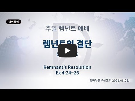 2022년 2월 3일(목) 분류 주일예배 설교- 렘넌트 예배 제목 렘넌트의 결단 성경 출애굽기 4:24-26 일시/장소 2021년 8월 8일, 임마누엘 교회 강사 류광수 목사 (정리: 차동호 목사) 주제어 ♠성경말씀 (