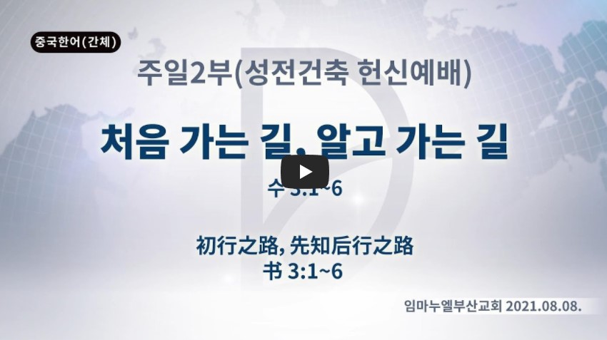 2022년 2월 4일(금) 분류 주일예배 설교- 주일2부 제목 처음 가는 길, 알고 가는 길 성경 여호수아 3:1-6 일시/장소 2021년 8월 8일, 임마누엘 교회 강사 류광수 목사 (정리: 차동호 목사) 주제어 ♠성