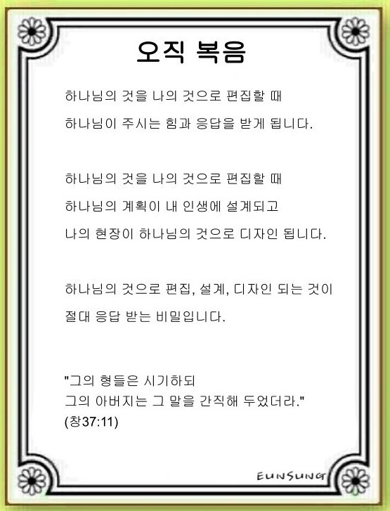 하나님의 것을 나의 것으로 만드는 중요한 편집을 해야 합니다. 그렇지 않으면 작은 일에도 시험이 들고 무너지게 됩니다. 요셉, 모세, 사무엘, 다윗, 엘리사, 바벨론의 포로들, 로마까지 살린 초대교회 성도들이 가졌던 편집과 각인의 시간을 가져 보세요. 이 시간에 집중할 때 큰 힘과 큰 응답을 받게 됩니다.