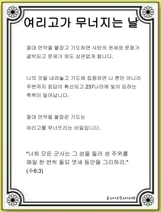 대부분이 ‘나’라는 틀에 갇혀 진짜 축복을 놓치고 있습니다. 지금 이 시간 나의 것을 내려놓고 온전히 기도에 집중한다면 여리고가 무너지고 전 세계 237개 나라에 빛이 임하는 축복이 일어납니다.