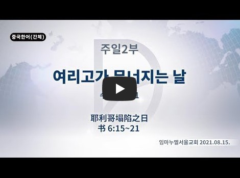 2022년 2월 15일(화) 분류 주일예배 설교- 주일2부 제목 여리고가 무너지는 날 성경 여호수아 6:15-21 일시/장소 2021년 8월 15일, 임마누엘 교회(서울) 강사 류광수 목사 (정리: 차동호 목사) 주제어 ♠