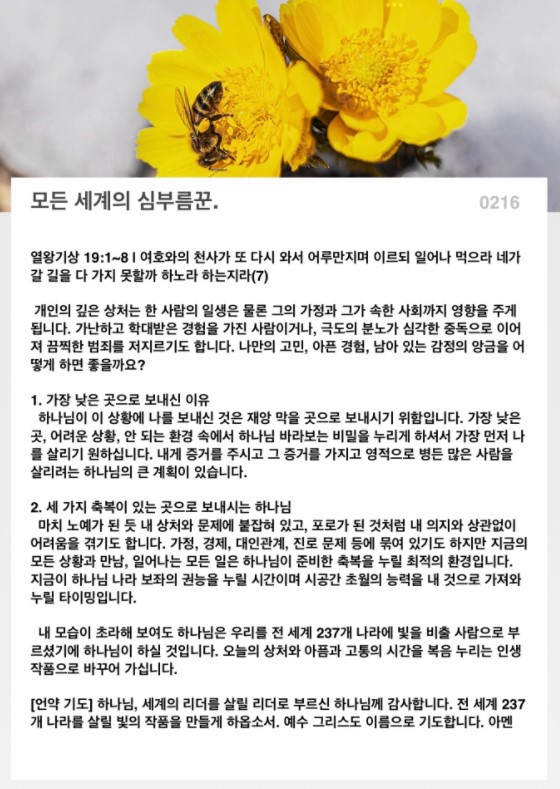 내 모습이 초라해 보여도 하나님은 우리를 전 세계 237개 나라에 빛을 비출 사람으로 부르셨기에 하나님이 하실 것입니다. 오늘의 상처와 아픔과 고통의 시간을 복음 누리는 인생 작품으로 바꾸어 가십니다.