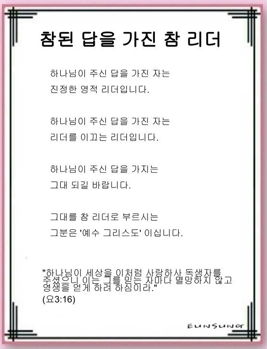 하나님은 나와 우리를 향한 전무후무한 응답을 준비하고 계십니다. 응답은 학업과 산업, 교회, 여러 만남 속에 숨겨져 다양한 사건과 축복의 형태로 드러납니다. 때문에 너무 낙심하거나 반대로 너무 기뻐할 이유도 없습니다. 오직 복음이라는 성숙한 영적 자세로 하나님이 이루실 목표를 믿고 기다리면 됩니다.