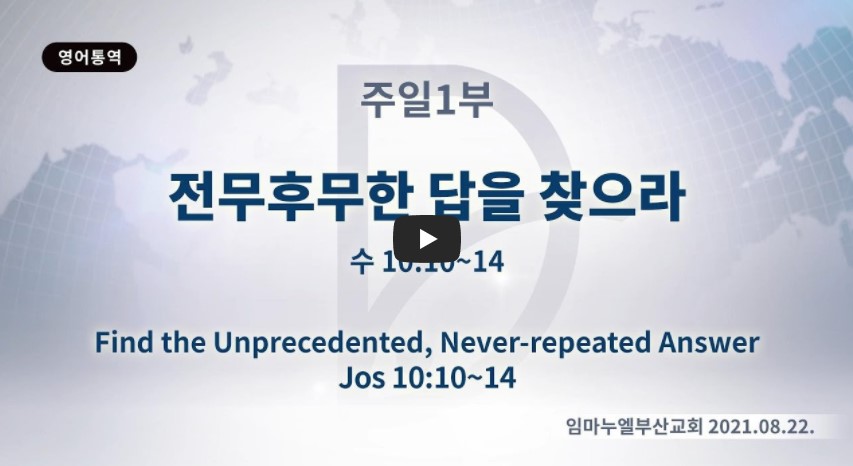 2022년 2월 18일(금) 분류 주일예배 설교- 주일1부 제목 전무후무한 답을 찾으라. 성경 여호수아 10:10-14 일시/장소 2021년 8월 2일, 임마누엘 교회(부산) 강사 류광수 목사 (정리: 차동호 목사) 주제어