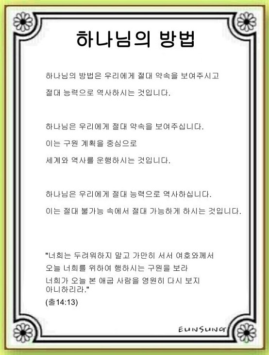 인터넷총국 (홈페이지 http://data.rutc.com) 후원: (국민은행) 856701-04-233309 (사)세계복음화전도협회 인터넷총국 분류 주일예배 설교- 렘넌트 예배 제목 하나님의 방법 성경 출애굽기 14:1-13 일시/장소