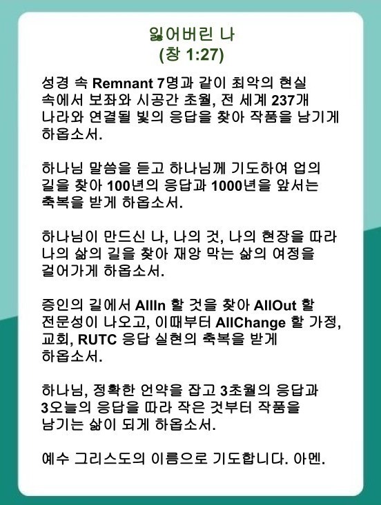 [언약 기도] 하나님, 정확한 언약을 잡고 3초월의 응답과 3오늘의 응답을 따라 작은 것부터 작품을 남기는 삶이 되게 하옵소서. 예수 그리스도 이름으로 기도합니다. 아멘