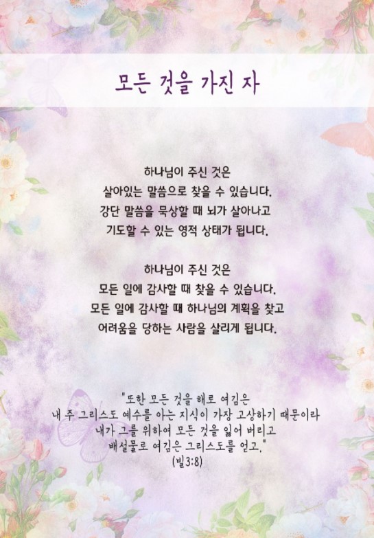 하나님은 우리에게 모든 것을 주셨습니다. 그런데 우리는 아무것도 가지지 못한 것처럼, 다른 것이 필요한 것처럼 착각합니다. 하나님이 주신 것을 내 것으로 가져와 누리는 시간이 없기 때문입니다. 어떻게 하나님이 주신 것을 찾을 수 있을까요?