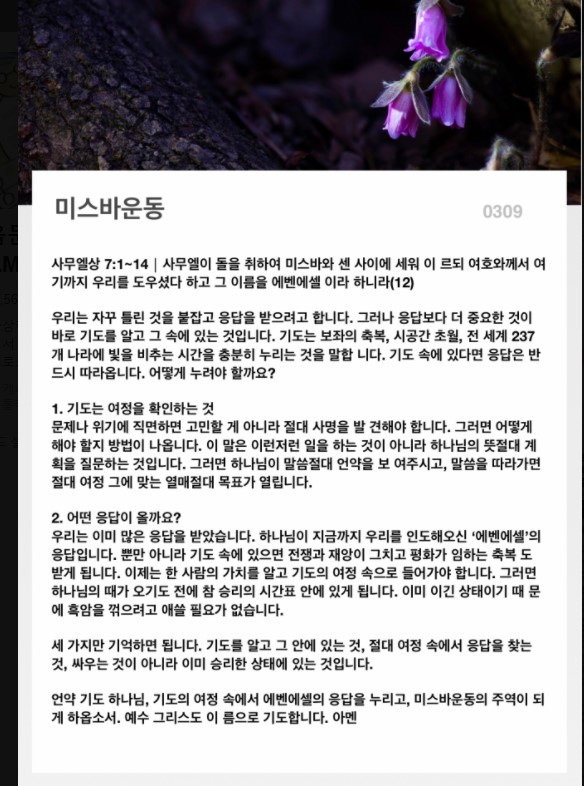 [언약 기도] 하나님, 기도의 여정 속에서 에벤에셀의 응답을 누리고, 미스바운동의 주역이 되게 하옵소서. 예수 그리스도 이름으로 기도합니다. 아멘