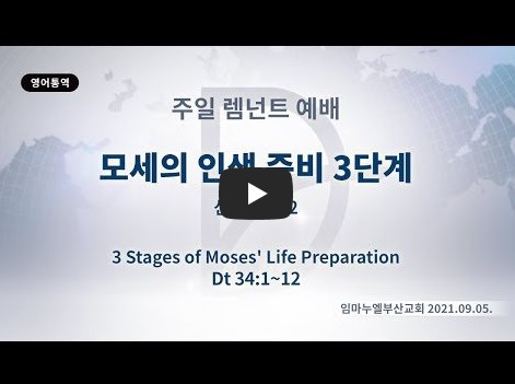 2022년 3월 10일(목) 분류 주일예배 설교- 렘넌트 예배 제목 모세의 인생준비 3단계 성경 신명기 34:1-12 일시/장소 2021년 9월 5일, 임마누엘 교회(부산) 강사 류광수 목사 (정리: 차동호 목사) 주제어