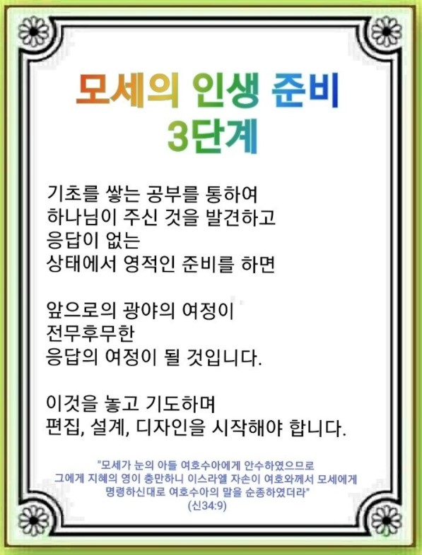 모세는 40년 동안 왕궁 생활을 하며 세계문화를 경험하고 엘리트 교육을 받았습니다. 그러나 모세의 공부는 기초를 쌓는 것이지 답이 되지 않았습니다. 중요한 것은 하나님께서 주신 나, 나의 것, 나의 현장을 발견하는 것입니다. 미디안에서는 응답이 없는 상태에서 영적 준비를 했습니다. 어릴 때 어머니에게 들은 복음을 바탕으로 창세기를 기록하고 가문과 개인의 언약을 발견했습니다.