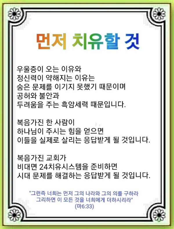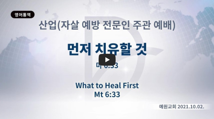 2022년 4월 11일(월) 분류 산업선교 제목 제1,2,3RUTC응답의 현장(37) - (자살예방전문인주관예배) 먼저 치유 할 것 성경 마태복음 6:33 일시/장소 2021년 10월 2일, 예원교회(온라인) 설교 류광수 목사 (