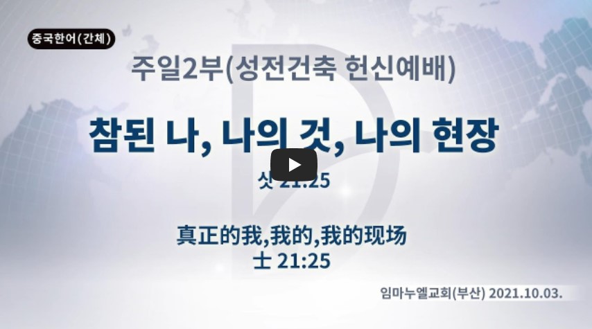 2022년 4월 15일(금) 분류 주일예배 설교- 주일2부 제목 (성전건축헌신예배) 참된 나, 나의 것, 나의 현장 성경 사사기 21:25 일시/장소 2021년 10월 3일, 임마누엘교회 설교 류광수 목사 (녹취정리: 차