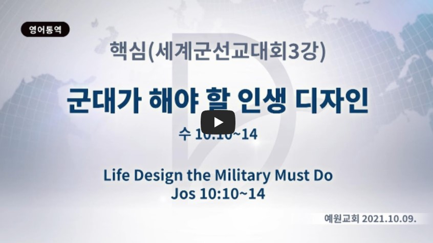 2022년 4월 19일(화) 분류 핵심훈련- 2021 세계군선교대회 제목 제1,2,3 RUTC응답의 현장(38)-(세계군선교대회 3강) 군대가 해야 할 인생 디자인 성경 여호수아 10:10-14 일시/장소 2021년 10월 9일, 예원교