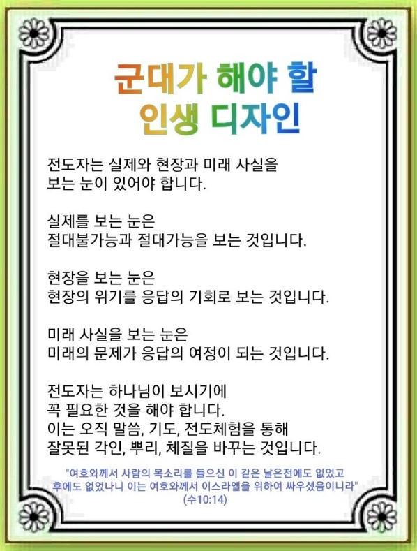 | 군대가 해야 할 인생 설계(여호수아 1:1~9)-기도수첩 (0) | 2022.04.18 |