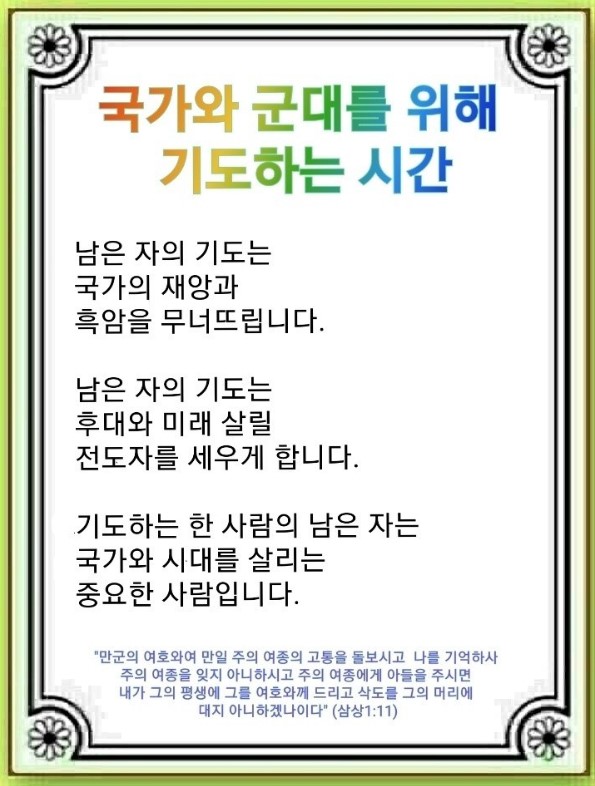 군 현장에 각종 사건과 자살 소식이 들려오는데도 마음을 다해 국가와 군대를 두고 기도하는 사람은 거의 없습니다. 지금부터라도 국가와 군대를 장악한 흑암을 꺾고 후대 살릴 기도를 시작해야 합니다.