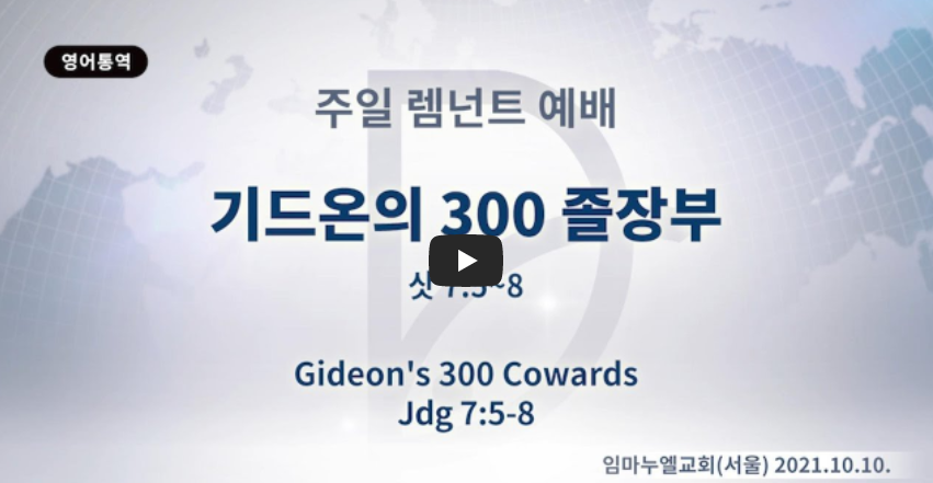 2022년 4월 21일(목) 분류 주일예배 설교- 렘넌트예배 제목 기드온의 300졸장부 성경 사사기 7:5-8 일시/장소 2021년 10월 10일, 임마누엘교회(서울) 설교 류광수 목사 (녹취정리: 차동호 목사) 출처 (사