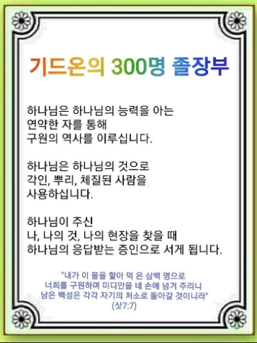 하나님은 아무 배경 없는 노예를 통해 일하시고, 포로로 잡혀간 힘없는 사람을 사용하십니다. 오늘 본문에 나오는 기드온도 벌목하던 사람이었습니다. 안락한 의식주, 풍족한 자산과 지위와 명예, 인기를 얻어도 이런 것으로는 마음의 밑바닥에 깔린 공허와 근원적 불안을 해소할 수 없습니다. 하나님은 시대마다 세상 배경이 아니라 하나님의 능력을 아는 연약한 자를 통해 구원의 역사를 이루십니다.