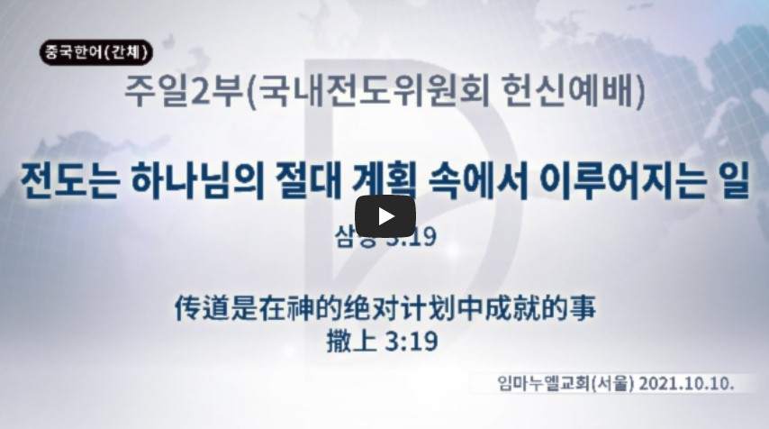2022년 4월 22일(금) 분류 주일예배 설교- 주일2부 제목 (국내전도위원회헌신) 전도는 하나님의 절대계획 속에서 이루어지는 일 성경 사무엘상 3:19 일시/장소 2021년 10월 10일, 임마누엘교회(서울)