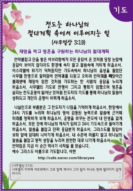 [언약 기도] 하나님, 24기도 속에 있게 하시고, 하나님의 영이 감동된 능력으로 영혼을 구원하는 일에 쓰임 받게 하옵소서. 예수 그리스도 이름으로 기도합니다. 아멘