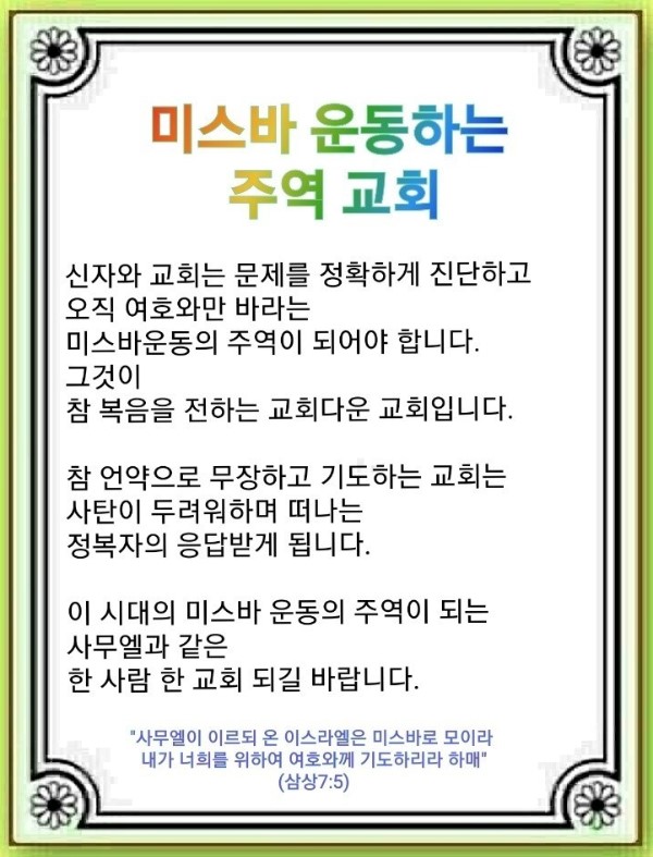 4. 우리 교회가 오직 십자가 보혈의 능력에 의지하고 여호와만 바라는 미스바운동의 주역이 되길 기도하기