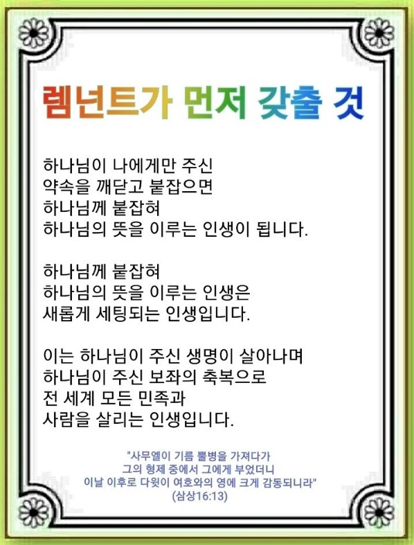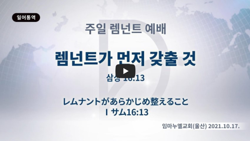 2022년 4월 30일(토) 분류 주일예배 설교- 렘넌트예배 제목 렘넌트가 먼저 갖출 것 성경 사무엘상 16:13 일시/장소 2021년 10월 17일, 임마누엘교회(부산) 설교 류광수 목사 (녹취정리: 차동호 목사) 출