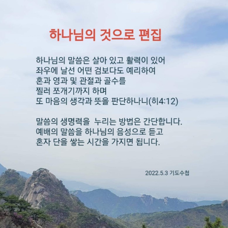 | 정복자의 기도(로마서 16:3~4)-기도수첩 (0) | 2022.05.05 |