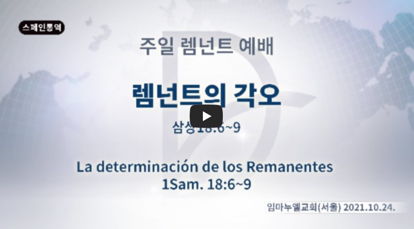 2022년 5월 7일(토) 분류 주일예배 설교- 렘넌트예배 제목 렘넌트의 각오 성경 사무엘상 18:6-9 일시/장소 2021년 10월 24일, 임마누엘교회(서울) 설교 류광수 목사 (녹취정리: 차동호 목사) 출처 (사)