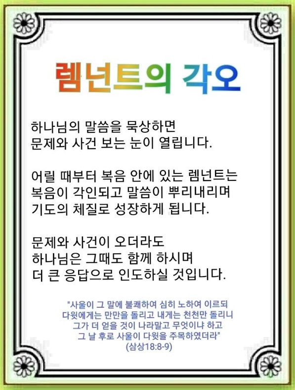 과거는 오늘을 위한 것이며, 오늘은 미래를 위한 것입니다. 어릴 때 보고 듣고 느낀 것은 쉽게 잊히지 않으며 평생 한 사람의 인생에 영향을 줍니다. 어릴 때부터 복음을 듣고 예배드리며 기도를 배운 Remnant는 복음이 각인되고 살아있는 하나님 말씀이 뿌리내려 모든 일에 하나님의 계획을 찾는 기도의 체질로 자라나게 됩니다. 혹시 문제와 사건이 눈앞에 왔더라도 걱정하지 않아도 되는 이유는 하나님이 지금 우리와 함께하시고 내버려 두지 않으시며, 결국 이 문제와 사건을 통해 더 큰 응답으로 우리를 이끌어 가십니다.