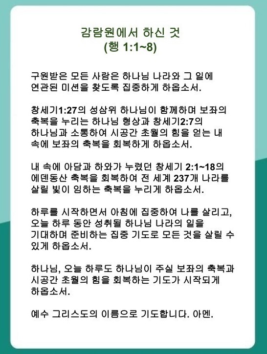 [언약 기도] 하나님, 오늘 하루도 하나님이 주실 보좌의 축복과 시공간 초월의 힘을 회복하는 기도가 시작되게 하옵소서. 예수 그리스도 이름으로 기도합니다. 아멘