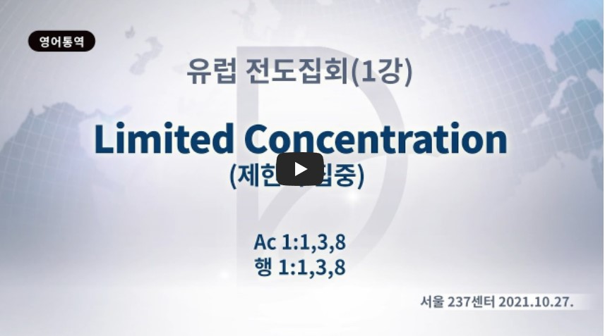 2022년 5월 13일(금) 분류 2021- 유럽전도집회 제목 1강: Limited concentration(제한된 집중) 성경 사도행전 1:1, 3, 8 일시/장소 2021년 10월 27일, 예원교회(온라인) 설교 류광수 목사 (녹취정리: 차동호 목사)