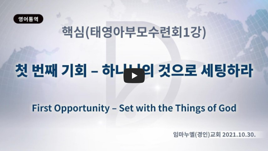 2022년 5월 19일(목) 분류 핵심훈련- 태영아 부모수련회 제목 제1,2,3 RUTC응답의 현장(41) (태영아부모수련회 1강) 첫 번째 기회- 하나님의 것으로 세팅하라 성경 일시/장소 2021년 10월 30일, 임마누엘