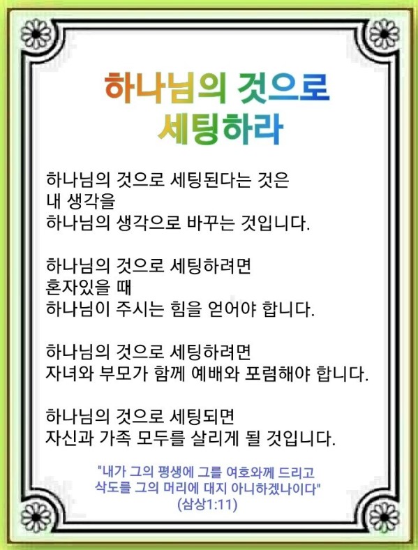 오늘도 수많은 생각을 하게 되는데 내 생각을 하나님의 생각으로 바꾸어야 합니다. 특히 자녀를 둔 부모는 하나님의 것으로 세팅되어야 합니다. 이것이 나 자신과 가정 모두를 살리는 길입니다. 어떻게 하나님의 것으로 세팅할 수 있을까요?
