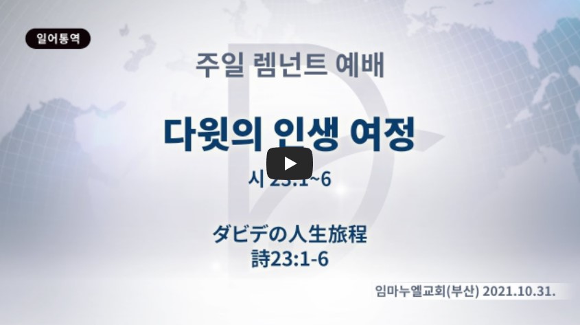 2022년 5월 23일(월) 분류 주일예배 설교- 렘넌트예배 제목 다윗의 인생 여정 성경 시편 21:1-6 일시/장소 2021년 10월 31일, 임마누엘교회 설교 류광수 목사 (녹취정리: 차동호 목사) 출처 (사) 세계복