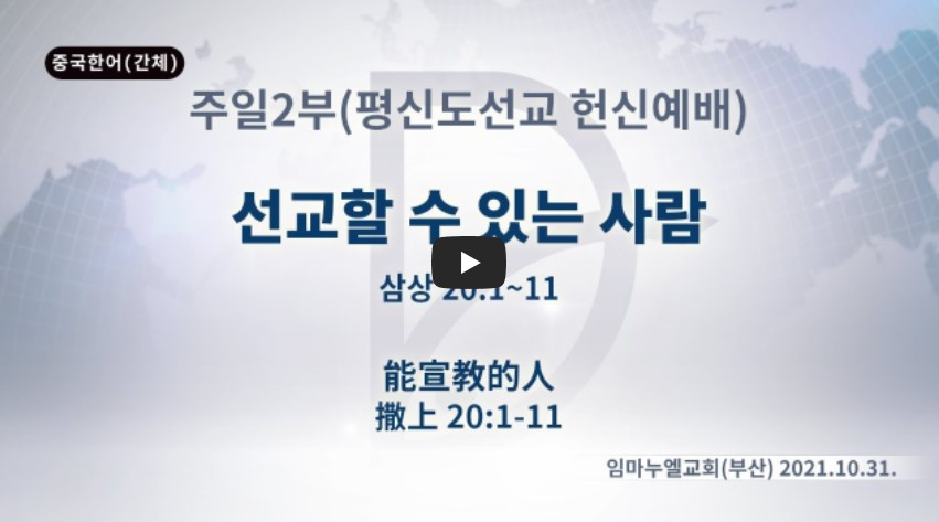2022년 5월 24일(화) 분류 주일예배 설교- 주일2부 제목 (평신도선교헌신) 선교할 수 있는 사람 성경 사무엘상 20:1-11 일시/장소 2021년 10월 31일, 임마누엘교회 설교 류광수 목사 (녹취정리: 차동호