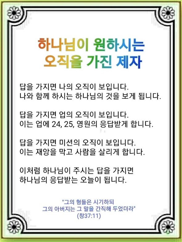 하늘의 축복이 이미 보좌의 응답으로 나에게 와 있습니다. 그래서 어떤 문제 속에서도 하나님의 답을 찾으면 됩니다. 하나님이 함께 하시는 오늘 속에 많은 미래와 응답이 담겨있습니다.