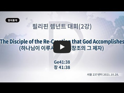 2022년 5월 27일(금) 분류 2021- 필리핀 렘넌트수련회 제목 2강: The Disciple of the recreation 성경 창세기 41:38 일시/장소 2021년 11월 5일, 237센터(온라인) 설교 류광수 목사 (녹취정리: 차동호 목사) 출처 (